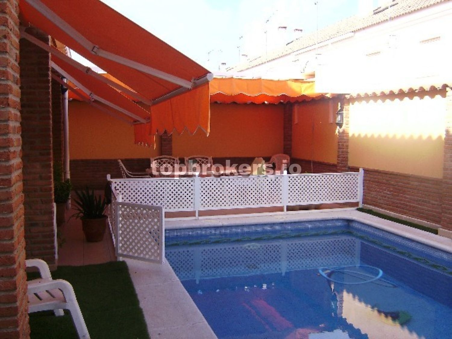 Unifamiliar adosada, régimen libre, de 700 m2, dos plantas, porche de entrada, semisótano, buhardilla y patio con piscina.
